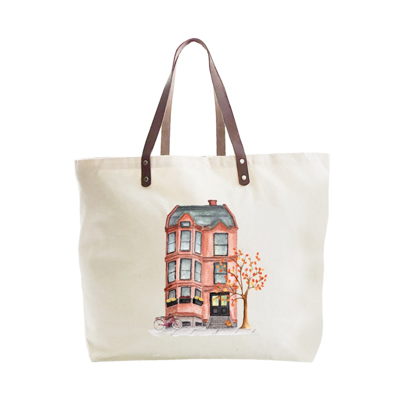 Large cotton canvas tote with leather handle is 22" x 15" x 5.5" and looks great with our original Tina Labadini Designs art. Our stylish totes are fun accessories and make great gifts.