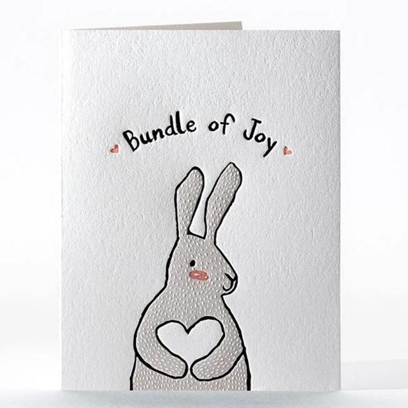 This sweet letterpress new baby card features an adorably soft gray bunny rabbit and is perfect for welcoming a new baby girl or boy. Full of tactile details, each cute letterpress card is printed with soy-based inks on soft, 100% repurposed, cotton rag pa