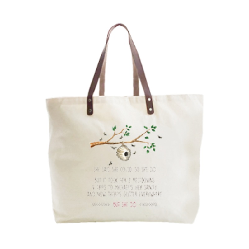 Large cotton canvas tote with leather handle is 22" x 15" x 5.5" and looks great with our original Tina Labadini Designs art. Our stylish totes are fun accessories and make great gifts.