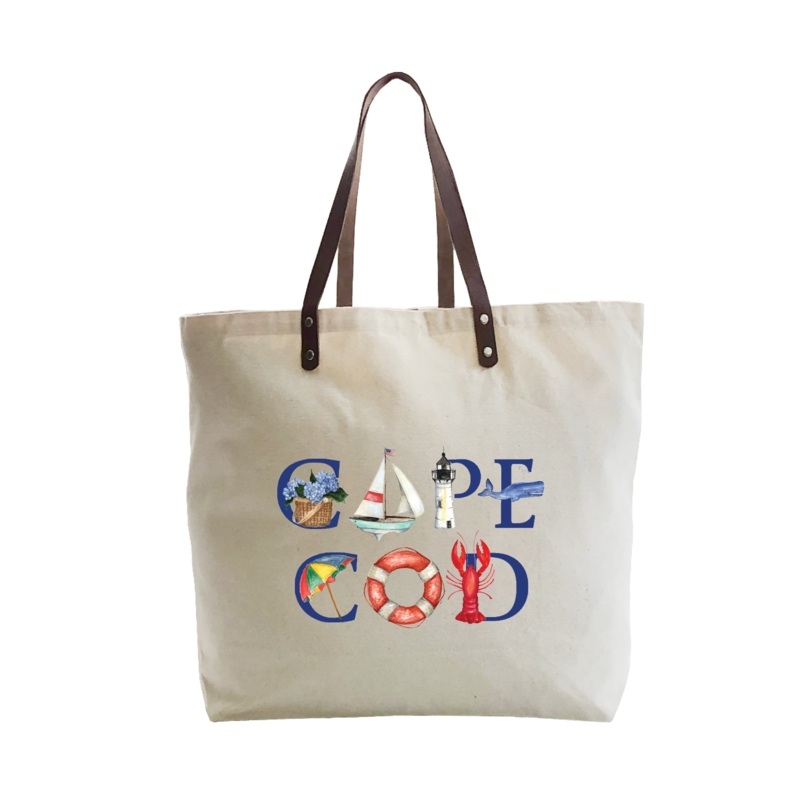 Large cotton canvas tote with leather handle is 22" x 15" x 5.5" and looks great with our original Tina Labadini Designs art. Our stylish totes are fun accessories and make great gifts.