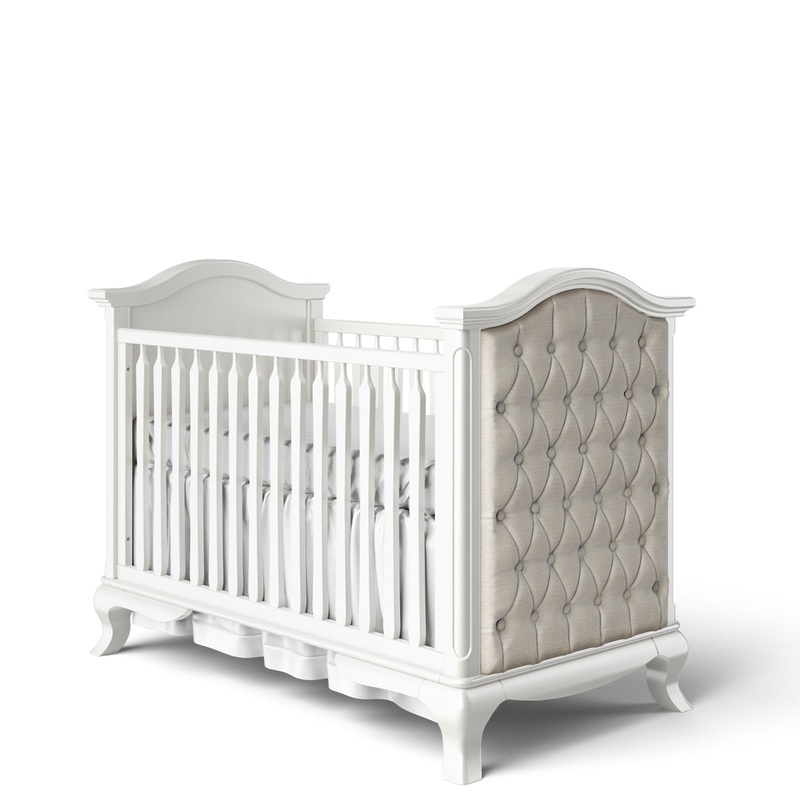 The Romina Cleopatra Classic Crib with Tufted sides elevates design expectations to the ultimate level of sophistication. The crib allows for toddler bed conversion (Toddler Rail purchased separately) and has 3 adjustable mattress height settings. The tufted panel is available in 4 organic and beautiful fabric options. Classic cribs have symmetrical sides which makes for easier placement in your nursery.