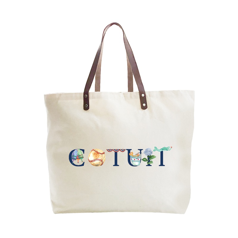 Large cotton canvas tote with leather handle is 22" x 15" x 5.5" and looks great with our original Tina Labadini Designs art. Our stylish totes are fun accessories and make great gifts.