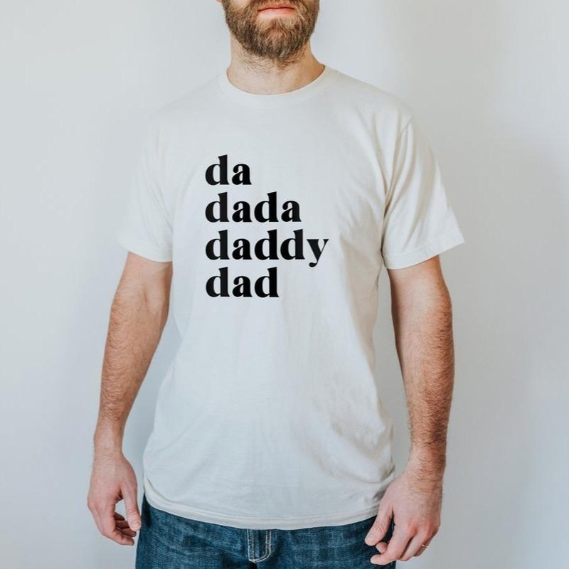 A fun, modern graphic tee for dads - and the progression of names he'll forever treasure! A sweet gesture for Father's Day or a memorable gift for a proud new papa. All artwork is original and printed in black ink on a super soft, 100% organic American-mad