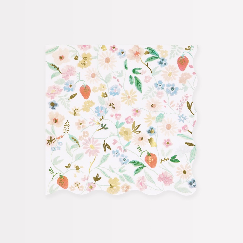 The elegant combination of watercolor flowers, strawberries and on-trend bows, in dreamy pastel colors, on these large napkins is perfect for garden parties, bridal showers or any celebration where you want a refined effect.