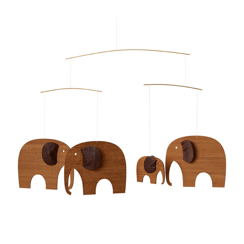DescriptionTextile designer Michala Stigkjaer transforms the classic Flensted elephant mobile into a unique new design using high-end materials for a sophisticated update. Made of laser-cut teak wood and leather ears. Hangs 14" tall by 25" wide. Large elep