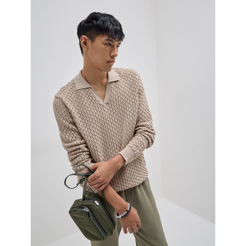 This taupe t-shirt from ETA is fashioned from a knit-textured fabric in a relaxed silhouette. It features a polo collar and full sleeves for sumptuous comfort.