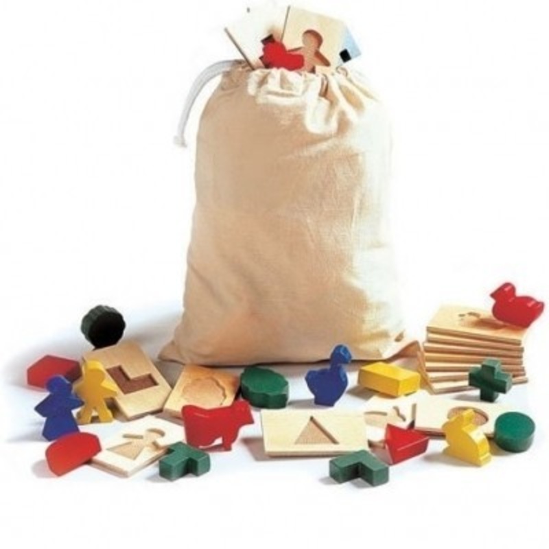Complete with 20 wooden shapes and matching, textured tiles provided in a durable canvas bag. Deal out the tiles and have children reach into the bag to feel and find the corresponding wooden shape. Play alone or in larger groups. A great visual and tactil