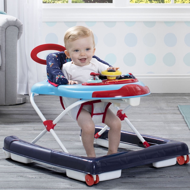 From baby steps to big steps, the First Exploration 2-in-1 Activity Walker from Delta Children is the perfect choice for your growing child. Two baby walkers in one, it transitions from an activity walker to a walk-behind walker. As an activity walker, the padded, high back chair offers plenty of comfort and support as your child begins exploring. The toy tray stimulates your baby’s visual and auditory senses during playtime with music, lights and a steering wheel–it’s easily removable so Baby can play with it anywhere. For meals or snack time, the toy tray easily pops off to reveal a spacious eating surface. Use this baby walker as a walk-behind when your child begins to take steps on their own, the comfy handle provides balance for beginning walkers. Plus, the ultra compact stow away position makes it easy to store this baby walker or take it on trips.