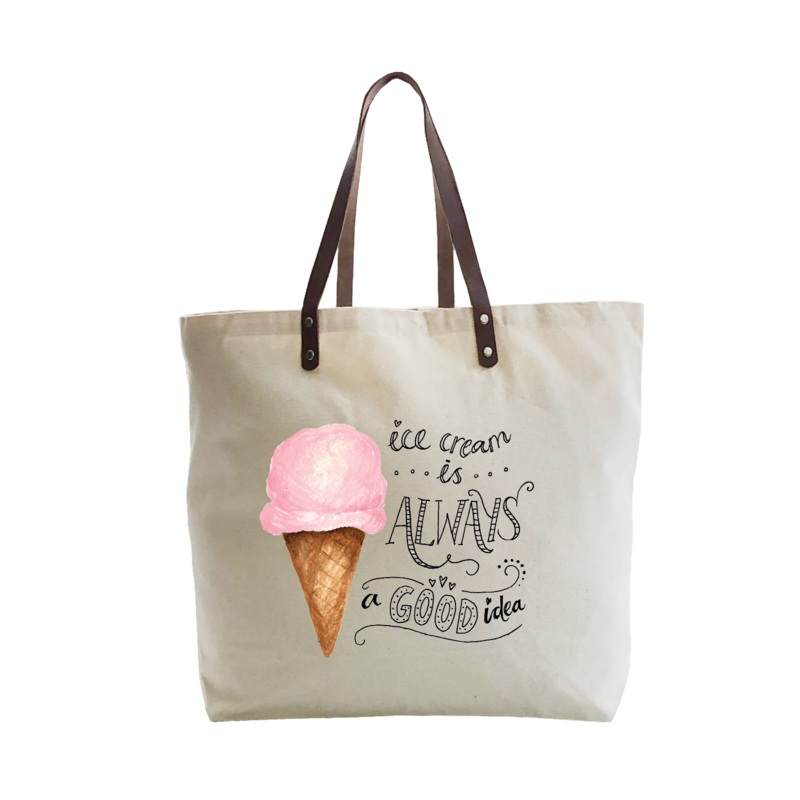 Large cotton canvas tote with leather handle is 22" x 15" x 5.5" and looks great with our original Tina Labadini Designs art. Our stylish totes are fun accessories and make great gifts.