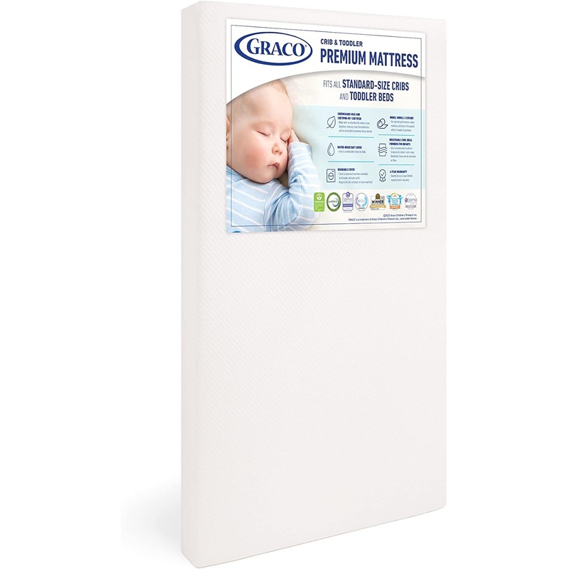 “Rest easy with this grow-with-you mattress! Anti-microbial, water resistant lining, and hypoallergenic so you dont have to worry about your childs sleeping safely! For standard or full size cribs: 27.6 x 52 x 5”