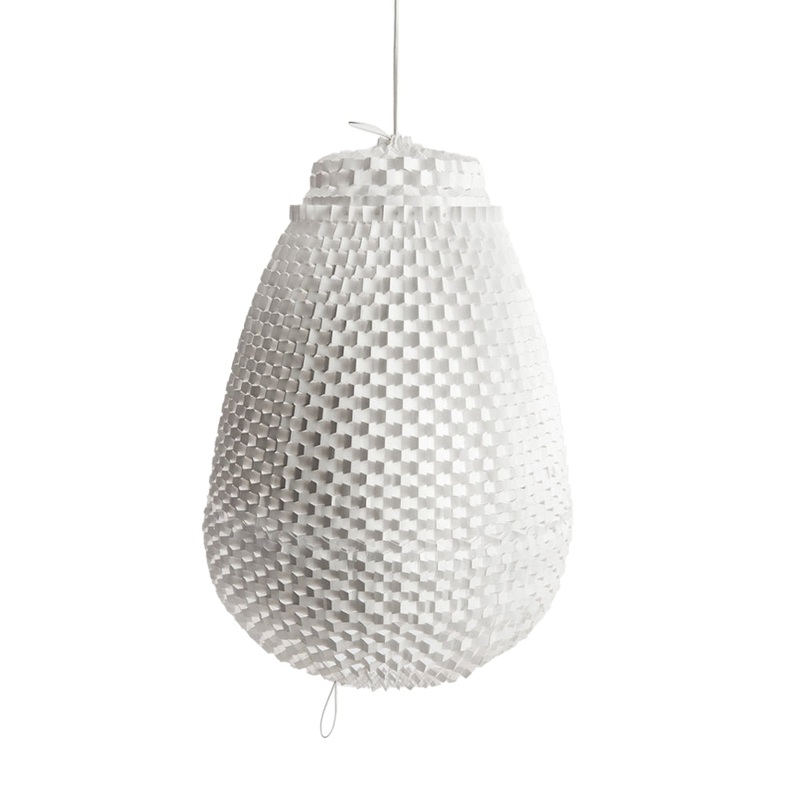 Description The Grand Trianon features a unique texture, pattern, and soft checkerboard glow. Made of Tyvek, a post-consumer coated plastic material, the striking size of the Grand Trianon are quieted by the delicate nature of Tyvek material.Diameter: 28 i