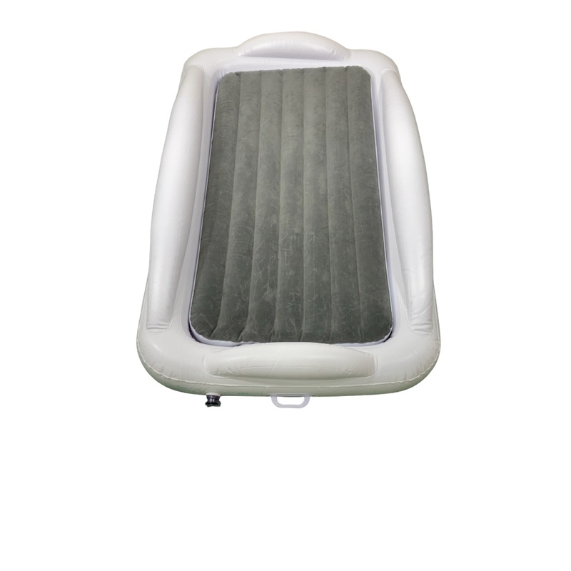 “Easy to carry travel bed for your tot with side bumpers to keep them sleeping safely anywhere. Inflates quickly with pump”