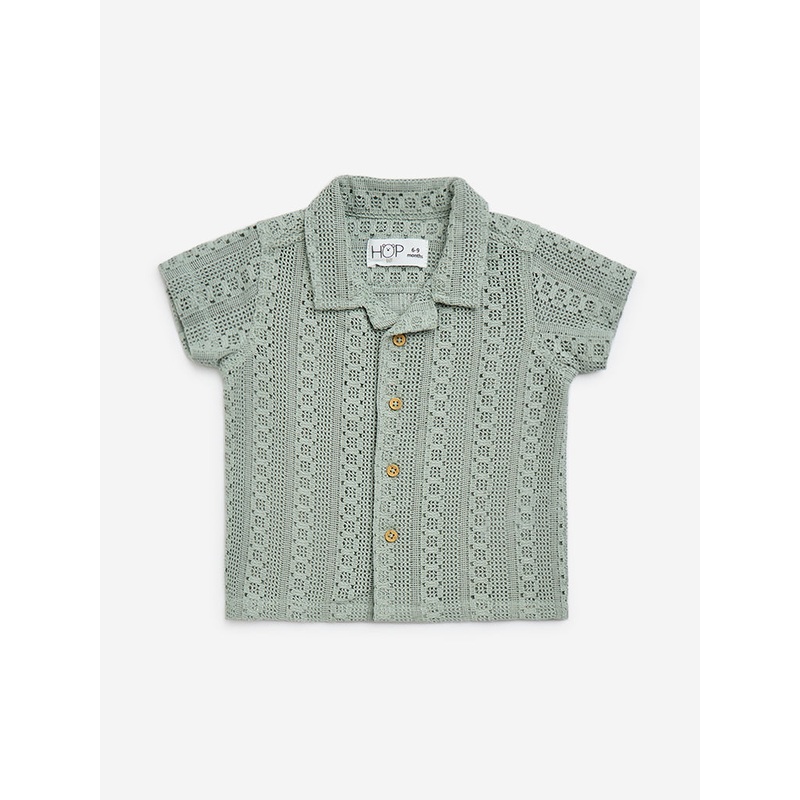 This sage shirt from HOP Baby is crafted from a crochet-knitted fabric for a soft, luxurious feel. Designed with a classic camp collar, it extends into a button placket and is finished with short sleeves for a relaxed yet refined look.