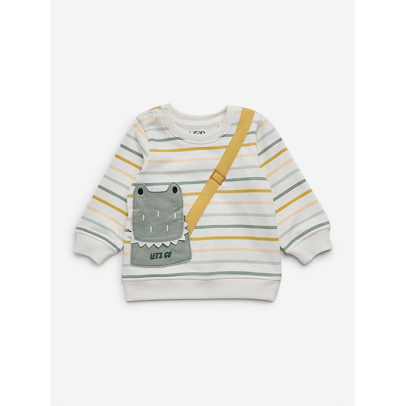 This white sweatshirt by HOP Baby boasts striped design and crocodile-applique detailing. The pure cotton garment is structured with a crew neck and full sleeves.