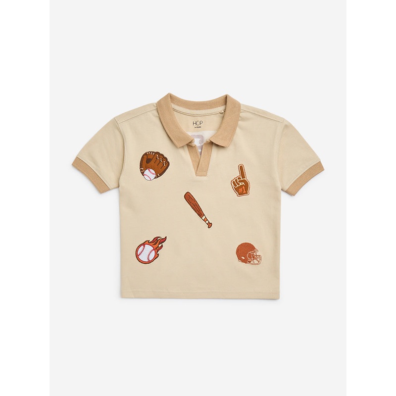 This beige t-shirt by HOP Kids is styled with playful baseball-themed embroidery in the front and text prints at the back. The pure cotton garment is structured with a collar neck and short sleeves.