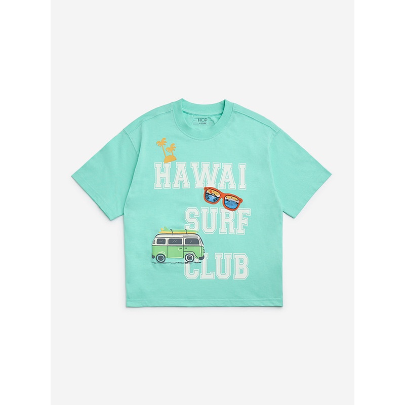 This green t-shirt from HOP Kids boasts striking text prints with vacation inspired motifs. Woven from cotton-rich fabric, this summer essential casual wear is finished with a round neck and short sleeves.