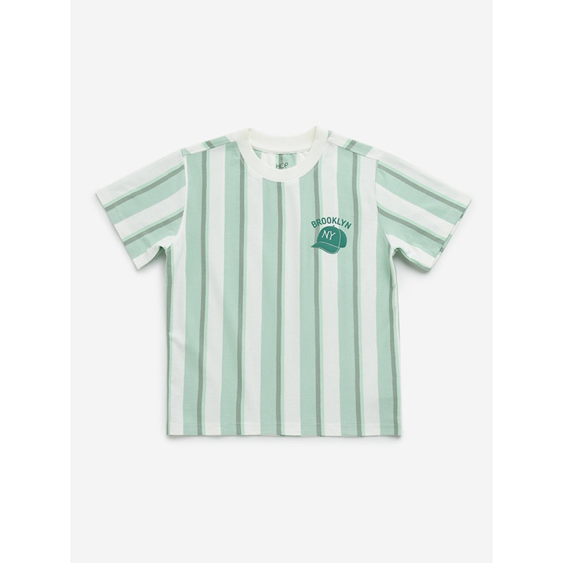 Featuring striped patterns, this green t-shirt from HOP kids is made from a cotton-rich fabric. It comes fitted with a crewneck and short sleeves.