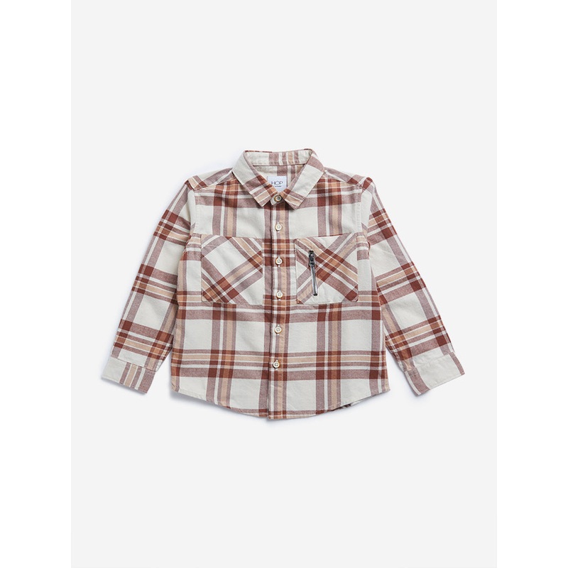 HOP Kids introduces this maroon shirt showcasing checkered prints. It is made from pure cotton material featuring a classic collar, button placket, full sleeves and front pockets adding to its stylish design.