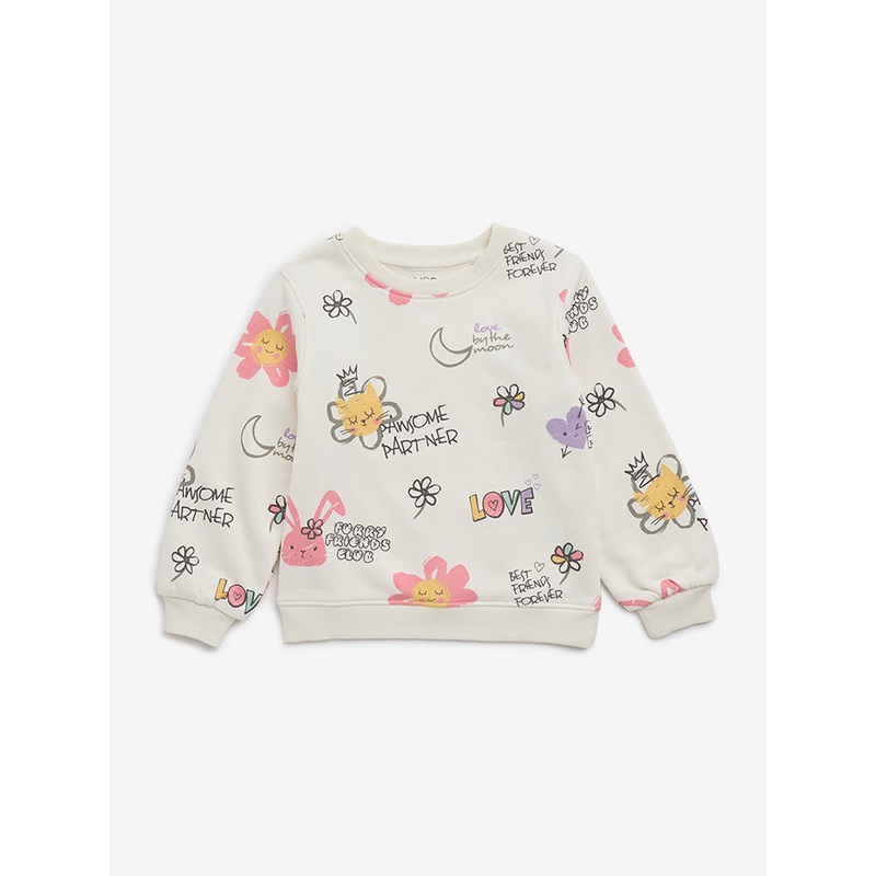 This off-white sweatshirt from HOP Kids is adorned with playful graphic prints, featuring cute characters and fun text for a whimsical touch. Crafted from a soft fabric, it includes a ribbed crew neck and full sleeves.