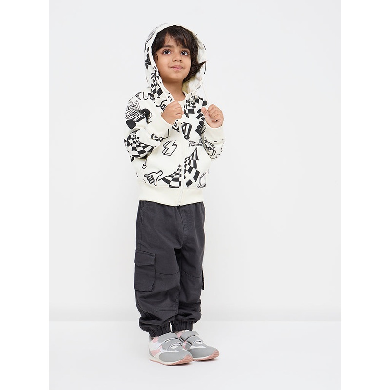HOP Kids brings you this off-white hoodie in funky prints. Its is built with breathable and warm fabric and offers a hooded neckline, secured with a zipline and full sleeves. The adjustable drawstrings of the hoodie and side pockets complete this stylish winter wear.