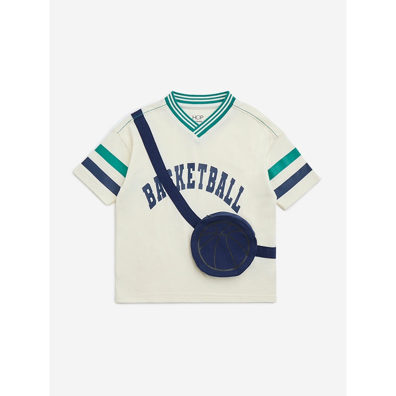 This off-white t-shirt from HOP Kids is designed for sporty charm, featuring bold text prints and a unique attached pouch with a basketball-inspired zipper closure. Crafted from a soft, cotton-rich fabric for all-day comfort, it is finished with a V-neck a