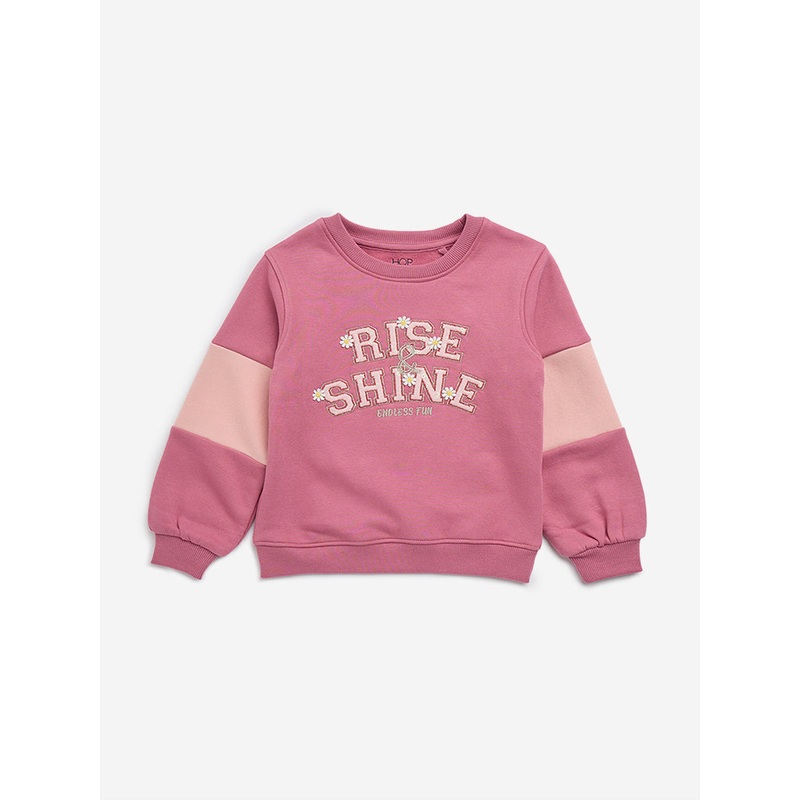 This pink sweatshirt from HOP Kids features a cheerful text embroidery with floral accents. Made from a soft fabric, it includes colour-blocked sleeves and a ribbed crew neck for a cozy, stylish look.