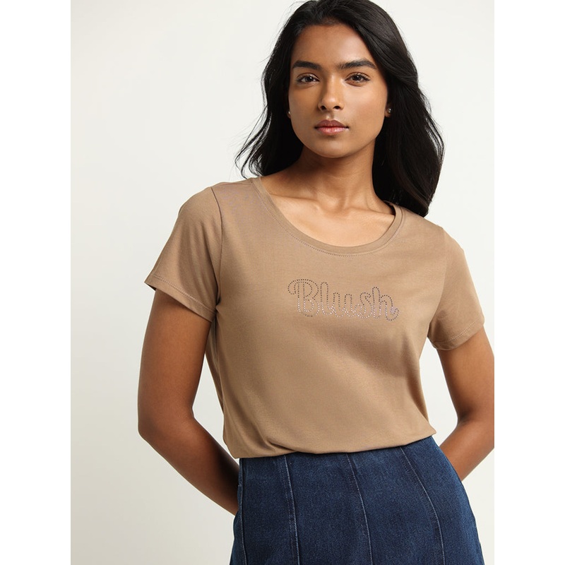 This LOV beige t-shirt features a blush script in delicate perforations, offering a round neck, and short sleeve.