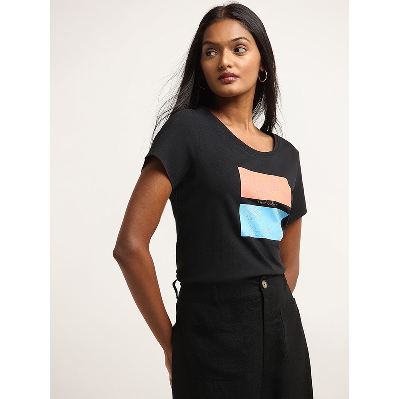 Black hue, round neckline, short sleeves, and printed t-shirt by LOV.