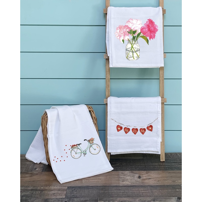 Celebrate your favorite mother, or mother figure in your life with three pieces of original and beautiful spring art, hand-painted by artist Tina Labadini. This set of three flour sack towels includes the MOM in hearts towel, bike with tulips trailing hearts towel, and the peonies in a jar towel. This gift set radiates the “MOM” in your life, and their sweetness, warmth and cheer. Its a lovely way to celebrate that special someone, including yourself. All our flour sack towels are 100% cotton (lint free and absorbent), measure 28×28, and can be machine washed and dried. So sweet and this will make for the perfect gift!