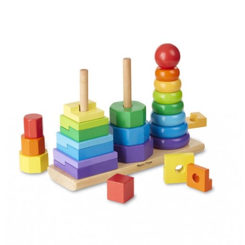Match and sort these 25 colorful wooden pieces, and skill-building is just part of the fun. Rings, octagons, and rectangles can be slotted onto the three rods, stacked on top of each other, or lined up to compare shapes, sizes, and colors. This first-conce
