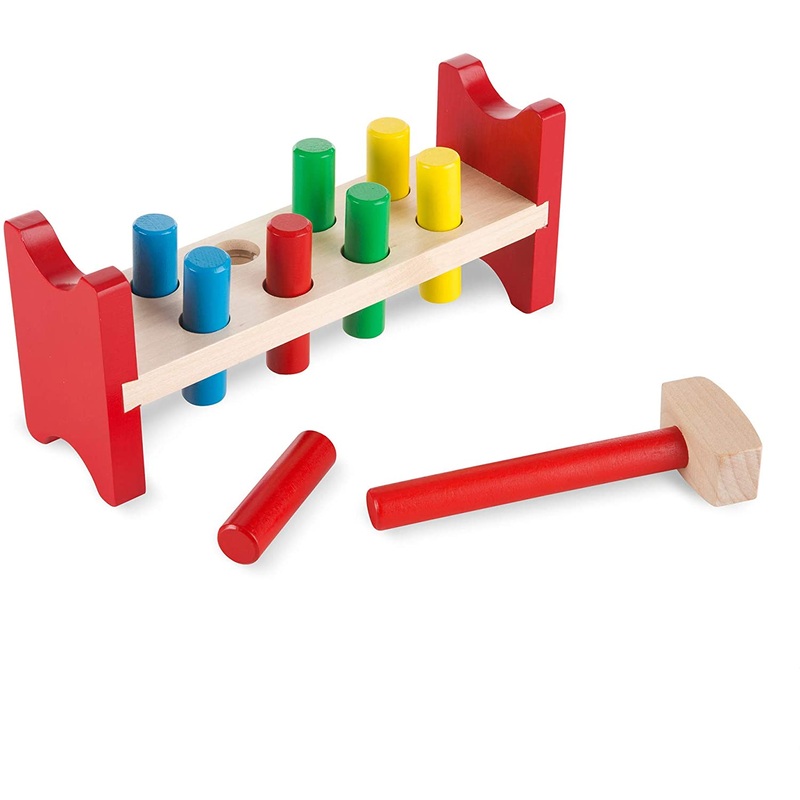 Pound the eight colorful wooden pegs into the wooden frame, then flip it over to repeat the activity again and again! Included are a wooden hammer and four pairs of pegs–great for color matching.