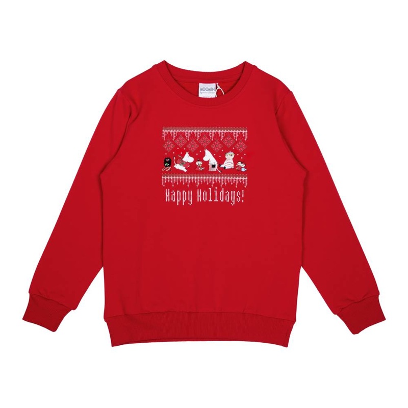 Red sweatshirt with long raglan sleeves, comfortable cut and soft brushed interior. The shirt has Moomin Valley pictures on the chest and the text “Happy Holidays!!”. The material is responsibly produced BCI cotton. Made according to Oeko-Tex standards.