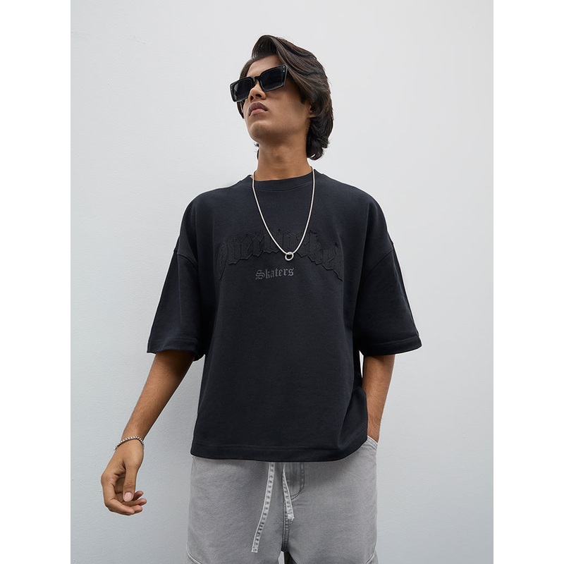 Nuon launches this black t-shirt boasting text embossments. It offers a trendy box-fit in its pure cotton build. The round neck and half sleeves complete this garment.