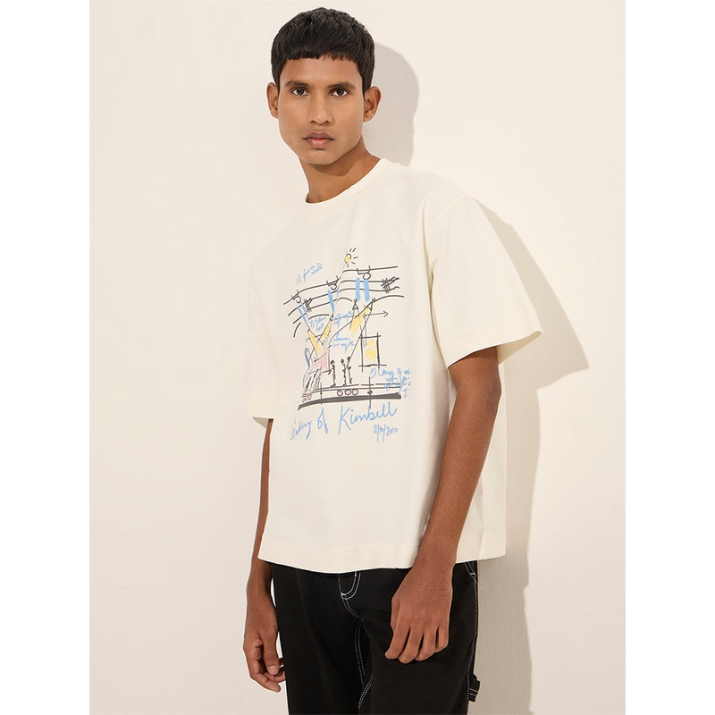 Off-white t-shirt from Nuon showcasing graphic designs at the front. Made from pure-cotton, the relaxed-fit creation includes a round neck and half sleeves.