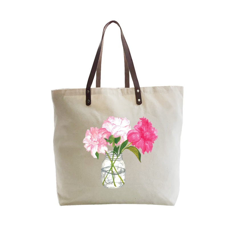 Large cotton canvas tote with leather handle is 22" x 15" x 5.5" and looks great with our original Tina Labadini Designs art. Our stylish totes are fun accessories and make great gifts.