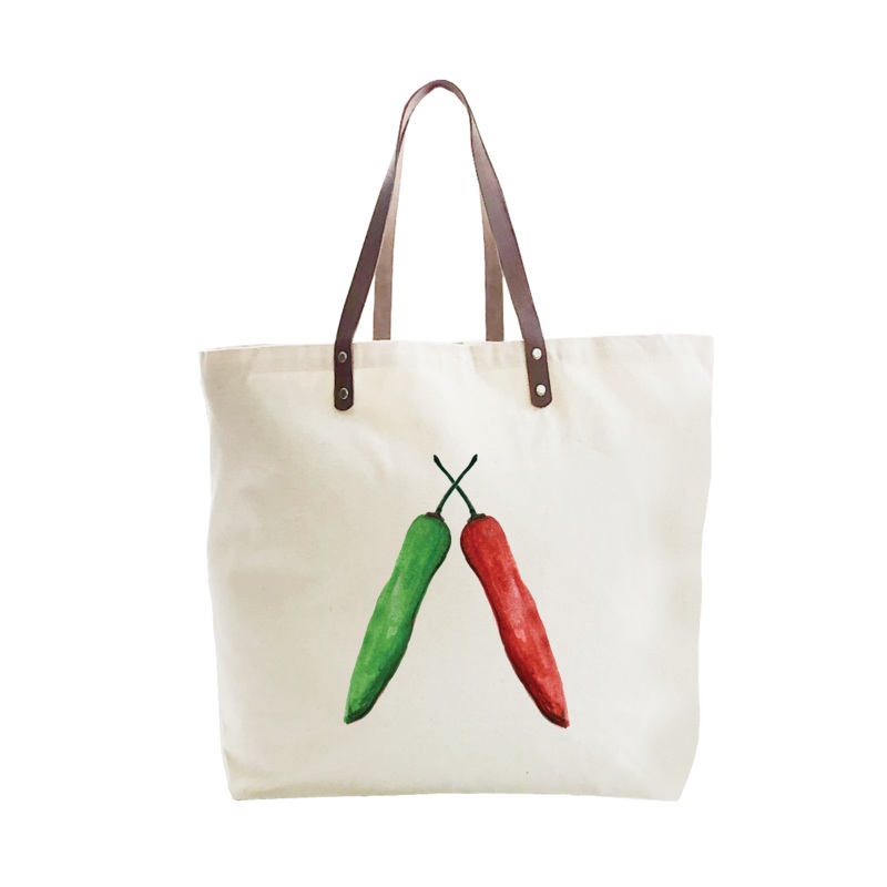 Large cotton canvas tote with leather handle is 22" x 15" x 5.5" and looks great with our original Tina Labadini Designs art. Our stylish totes are fun accessories and make great gifts.