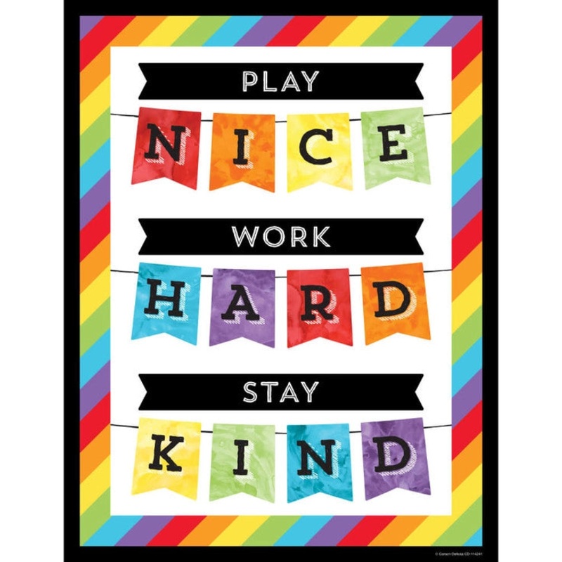 Inspire students to do their best with motivational charts. The 17″ x 22″ Celebrate Learning Play Nice Work Hard Stay Kind chart encourages students to remain focused on their goals and to create positive relationships in the classroom.