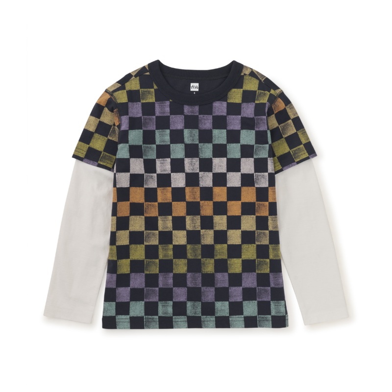 They will razzle-dazzle in this stunner of a layered tee that’s just right for winter wear. The original checkerboard print looks so cool with the complimentary white sleeves. The high-quality 100% cotton jersey holds its color and shape, wash after wash. Pair with Tea joggers or pants to complete the look. Above thigh length.