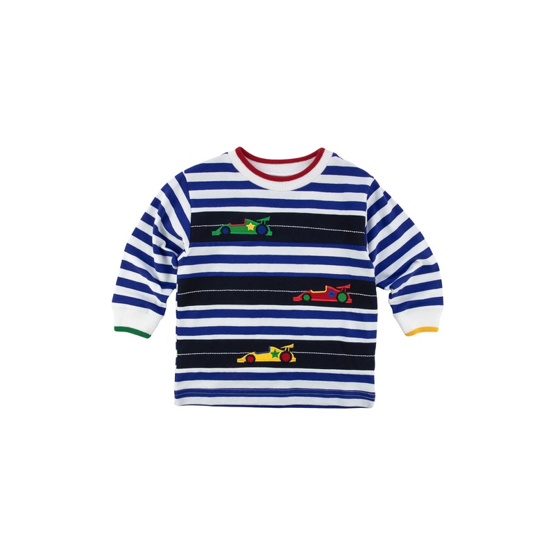 Zoom zoom! This Racecars Stripe Tee is perfect for your little racer, featuring classic blue French stripes and a lively racetrack graphic running across the chest.