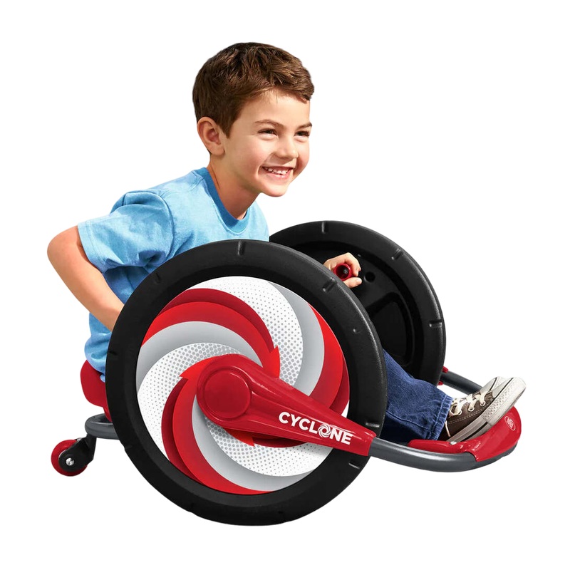 “Get on the go with this fast paced arm powered bike! The Cyclone allows for 360 degree spins and twists and 16″ wheels for hours of fumn! Ideal for ages 3 to 7 years.”
