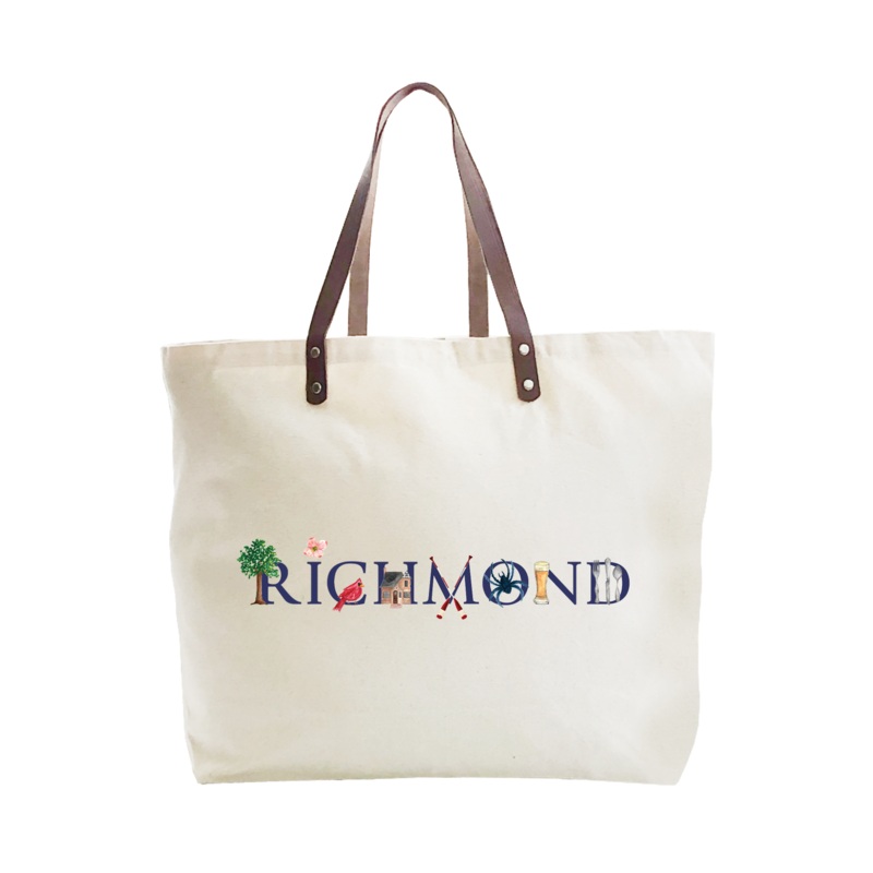 Large cotton canvas tote with leather handle is 22" x 15" x 5.5" and looks great with our original Tina Labadini Designs art. Our stylish totes are fun accessories and make great gifts.