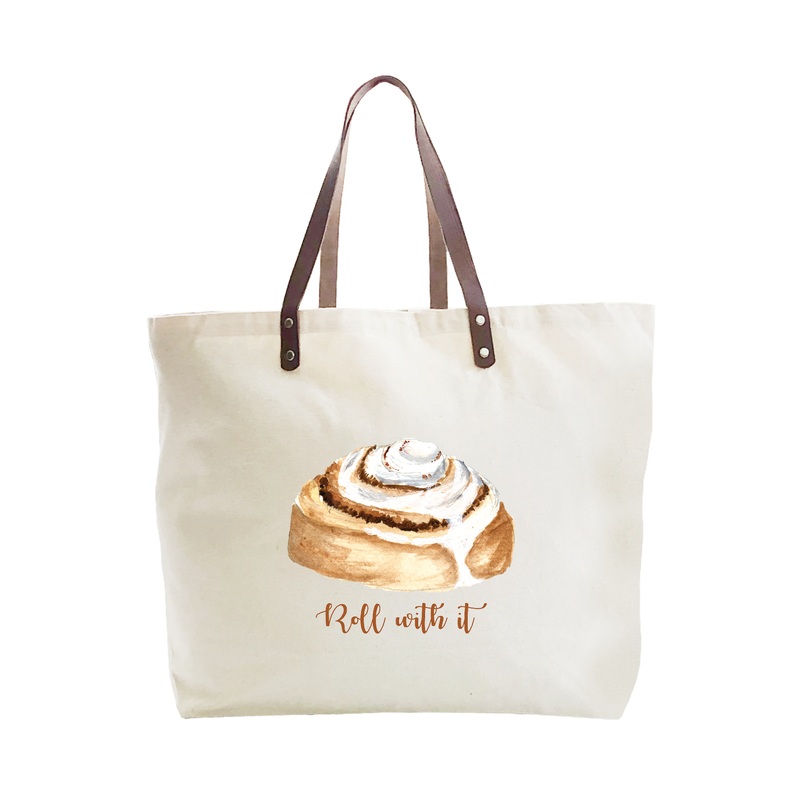 Large cotton canvas tote with leather handle is 22" x 15" x 5.5" and looks great with our original Tina Labadini Designs art. Our stylish totes are fun accessories and make great gifts.