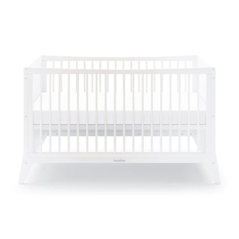 Discover true contemporary style with the new SnuzFino Cot Bed in White. The SnuzFino Cot Bed features two mattress heights and easily converts into a toddler bed for use up to 4 years of age, with a unique arched canopy and toddler rails for extra securit