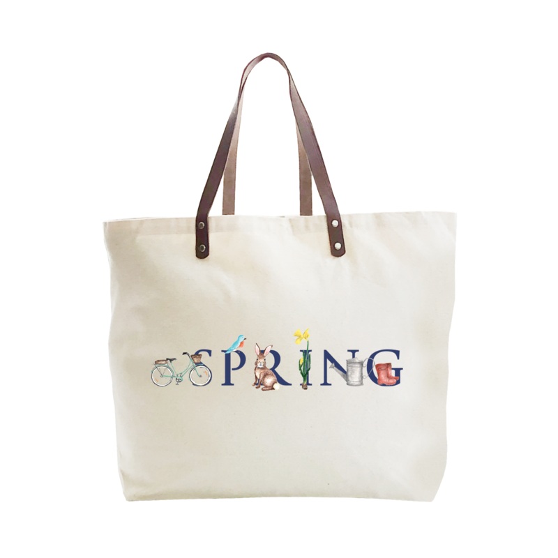 Large cotton canvas tote with leather handle is 22" x 15" x 5.5" and looks great with our original Tina Labadini Designs art. Our stylish totes are fun accessories and make great gifts.