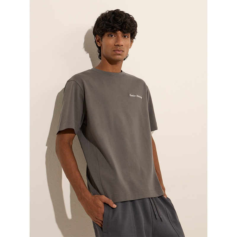 Studiofit launches this grey t-shirt designed with text embroidery. Crafted with soft and breathable fabric, it boasts a relaxed-fit frame. The garment carries a round neck and half sleeves.