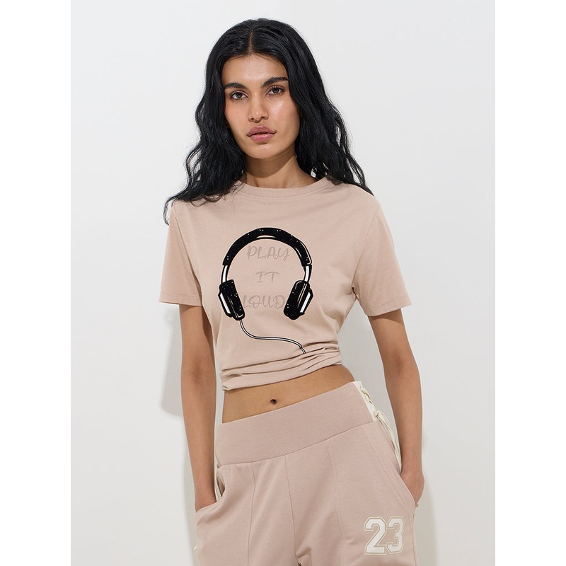 Make a stylish statement with this light beige cotton T-shirt by Studiofit, featuring a bold black headphone print for a trendy touch. Designed for all-day comfort, it comes with a ribbed round neck and half sleeves, making it a versatile addition to your