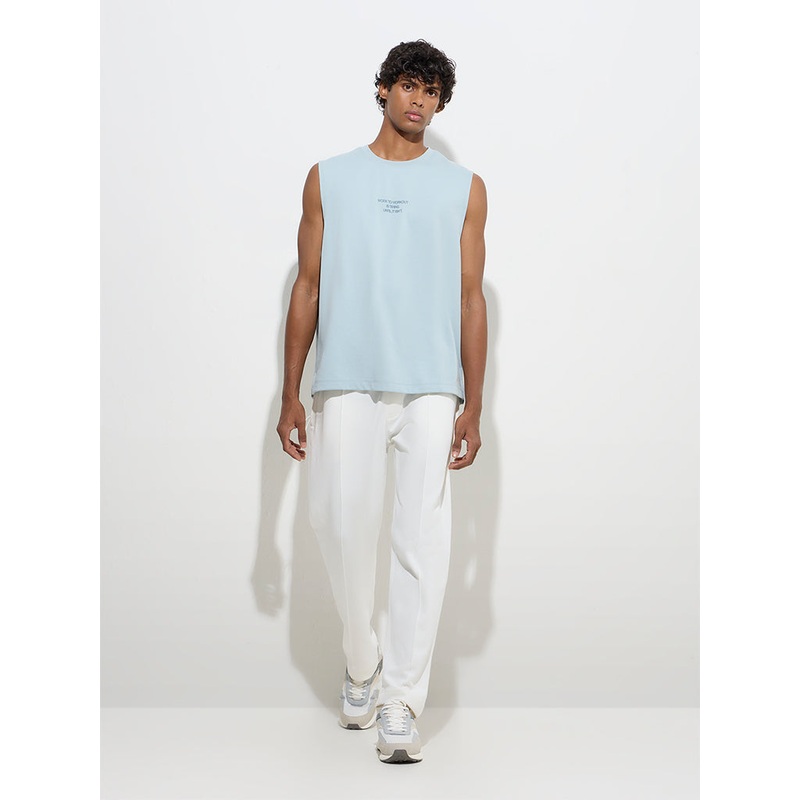 Studiofit launches this light blue t-shirt accented with dainty text prints for a sporty edge. Milled from a lightweight fabric, it features a crew neck and a sleeveless cut, making it an ideal choice for active days and casual lounging alike.