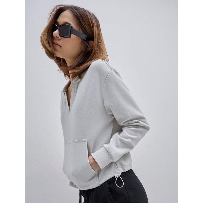 This light grey t-shirt by Studiofit features a notched collar, full sleeves, and kangaroo pocket. The adjustable straps at the waistline contribute in a comfortable fit.