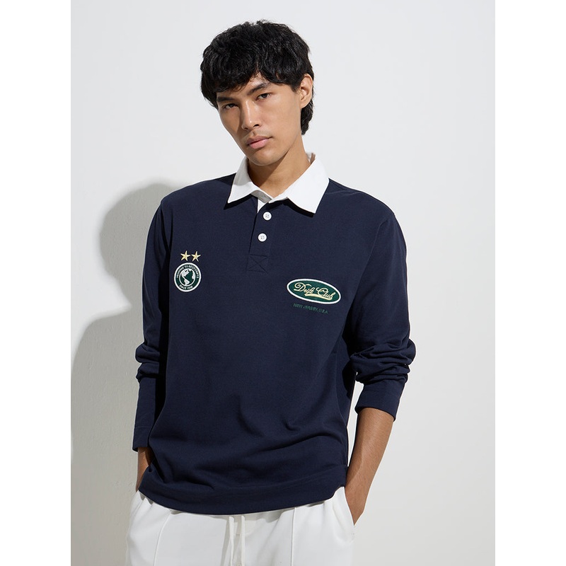 Studiofit presents this navy relaxed-fit sweatshirt, enhanced with stylish text embroidery for a modern touch. Crafted from a rich cotton blend, it features a contrasting white spread collar with a secure two-button placket and full sleeves, making it a versatile addition to your casual wardrobe.