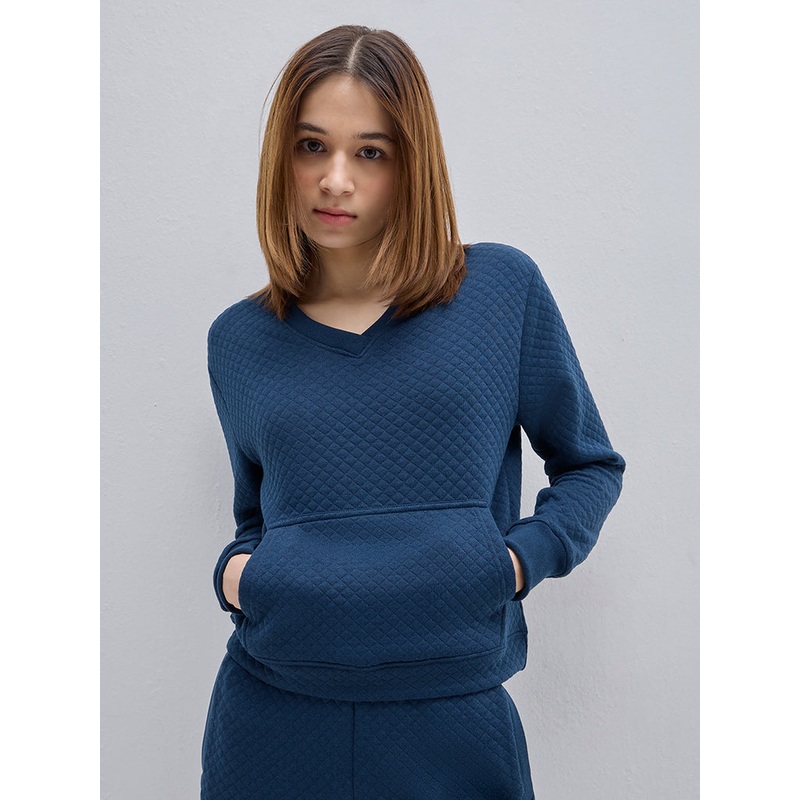 This teal Sweatshirt by Studiofit flaunts a quilted design. The garment is made with soft and breathable fabric and includes a V-neck and full sleeves. It is completed with a adorable kangaroo pockets.